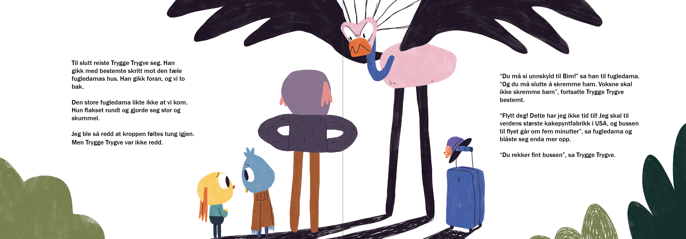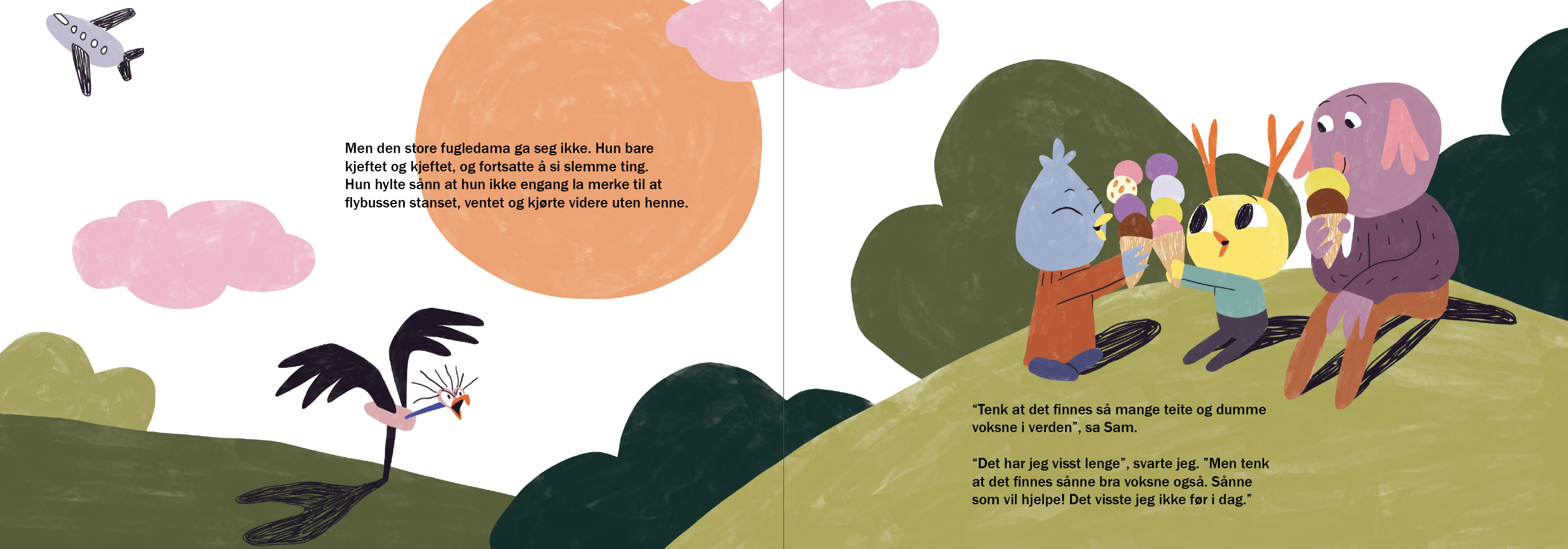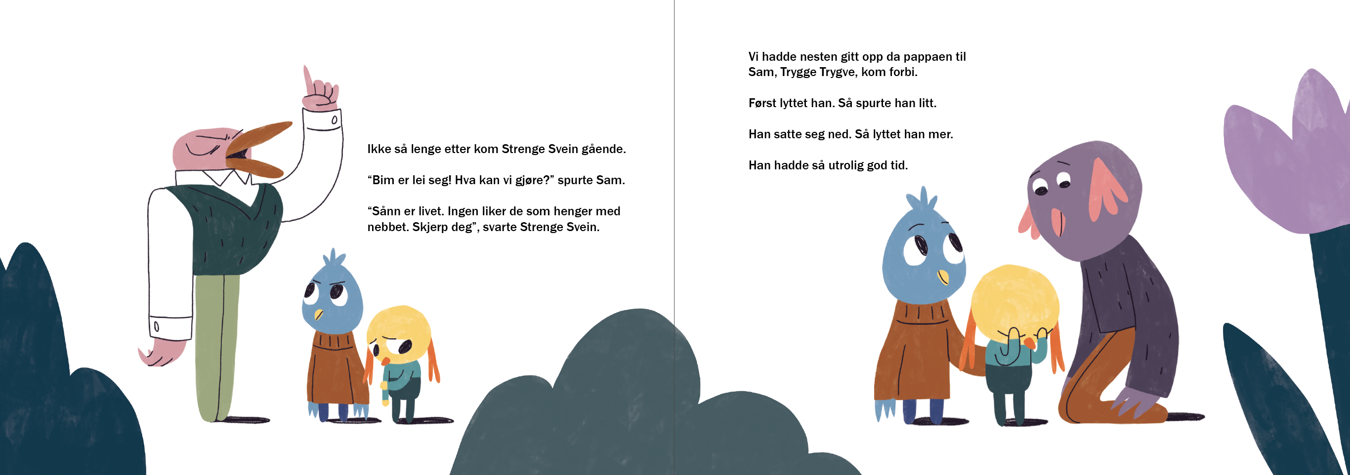I boken møter Bim mange ulike typer voksne. Noen er mer hjelpsomme og trygge enn andre, og vi kan nok alle kjenne oss igjen i de ulike typene, til ulike tider.